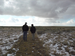 Two people walking on a path in the middle of the desert.