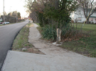 A concrete post at the edge of a sidewalk with overgrown plants and a residential street extending into the distance.