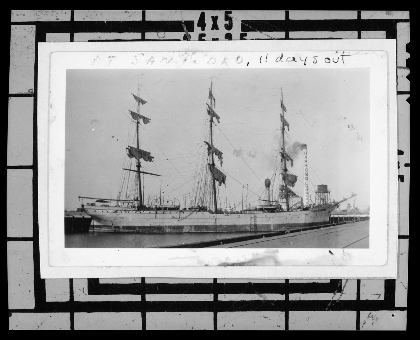PACIFIC QUEEN, San Pedro, CA, 1933; eleven days out of San Francisco.[CR][CR]Jack McGinty, photographer. Handwritten caption in ink located at top margin: "AT SAN PEDRO, 11 DAYS OUT."