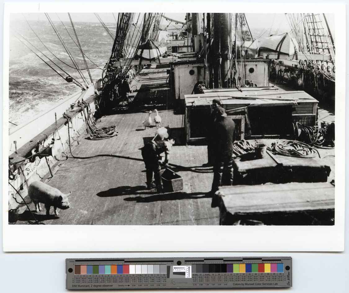 Beatrice (bark, ?m) view along the deck while under way at sea, undated