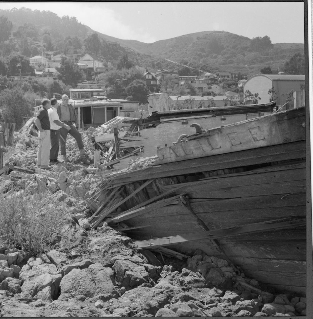 From left to right, Lou Goldblatt, Piero Patri, and Harlan Soeten standing on remnants of GALILEE's deck.[CR][CR]Twelve views taken during the expedition to the vessel. Involved were Harlan Soeten (San Francisco Maritime Museum Curator), Lou Goldblatt (ILWU Executive and SF Maritime Museum Boardmember) and Piero Patri (San Francisco Architect) per note on the enclosure. Large print has 12 views on one sheet.