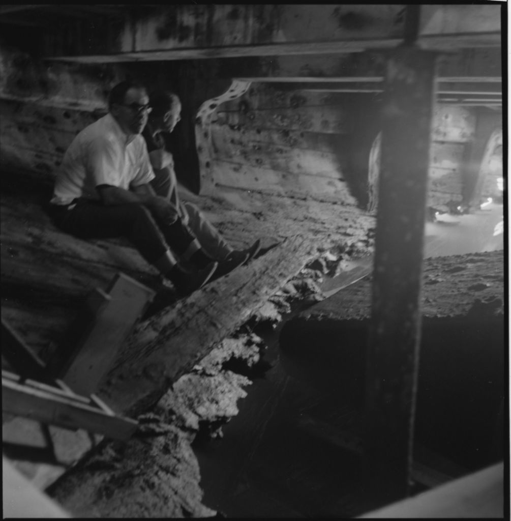 View of 2 men in the hold. Left to right are Piero Patri and Lou Goldblatt.[CR][CR]Twelve views taken during the expedition to the vessel. Involved were Harlan Soeten (San Francisco Maritime Museum Curator), Lou Goldblatt (ILWU Executive and SF Maritime Museum Boardmember) and Piero Patri (San Francisco Architect) per note on the enclosure. Large print has 12 views on one sheet.