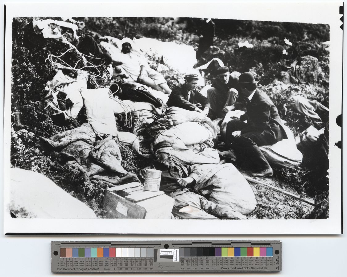 CITY OF RIO DE JANEIRO was a Pacific Mail Steamship Company passenger steamship. Shows survivors huddled together on the hillside with a few items brought with them from the wreck.[CR]Note on large print enclosure: "Not CITY OF RIO but Brit. bark GIFFORD."