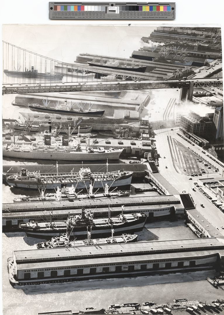 Aerial view south of the Ferry Building showing 17 vessels, mostly freighters, but a few are also cargo/passenger. Bay Bridge in view.
