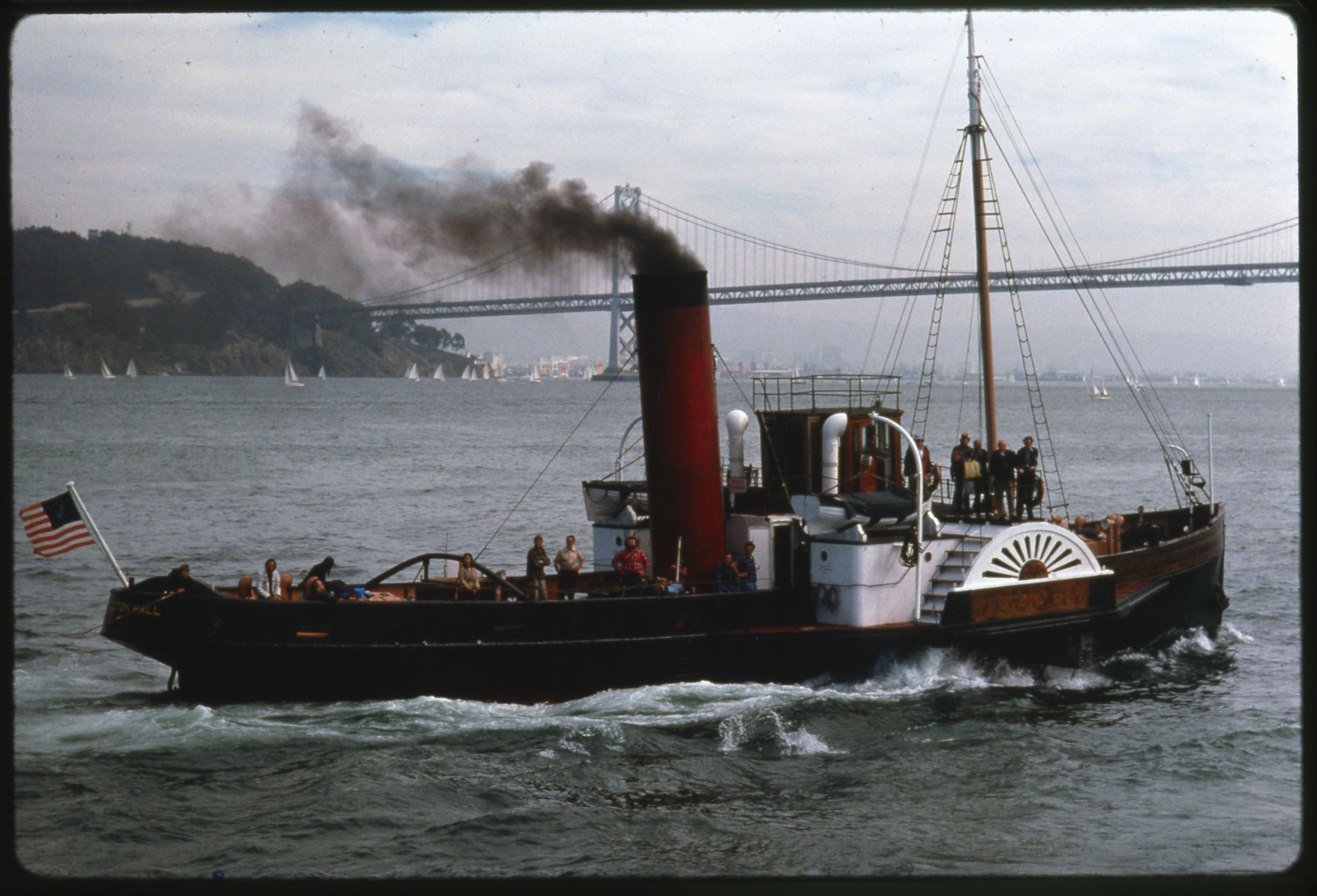 The Eppleton Hall is a steam sidewheeler with side-lever engines, and is the only remaining intact example of a Tyne paddle tug. These photographs document the Eppleton Hall arriving at San Francisco's Fisherman's Wharf on March 24, 1970. After extensive restorations in Newcastle, England, the tugboat was steamed to San Francisco by the owner, Captain Scott Newhall. Crew on this voyage via the Panama Canal included San Francisco Maritime Museum founder Karl Kortum and his son, John; restoration leader and rigging expert Bill Bartz, and his children Heide and Billy; as well as engineers and a purser. Despite technical difficulties, inclement weather conditions, and illness of the crew, she steamed through the Golden Gate on March 24, 1970. The vessel was donated to the National Park Service in 1979. She is now berthed at Hyde Street Pier. The slides were used in a presentation about the Eppleton Hall at the San Francisco Maritime National Historical Park on October 24, 1998. This portion of the slide show depicts the vessel along the San Francisco Waterfront, including Hyde Street Pier, in consequent years after arriving in San Francisco.