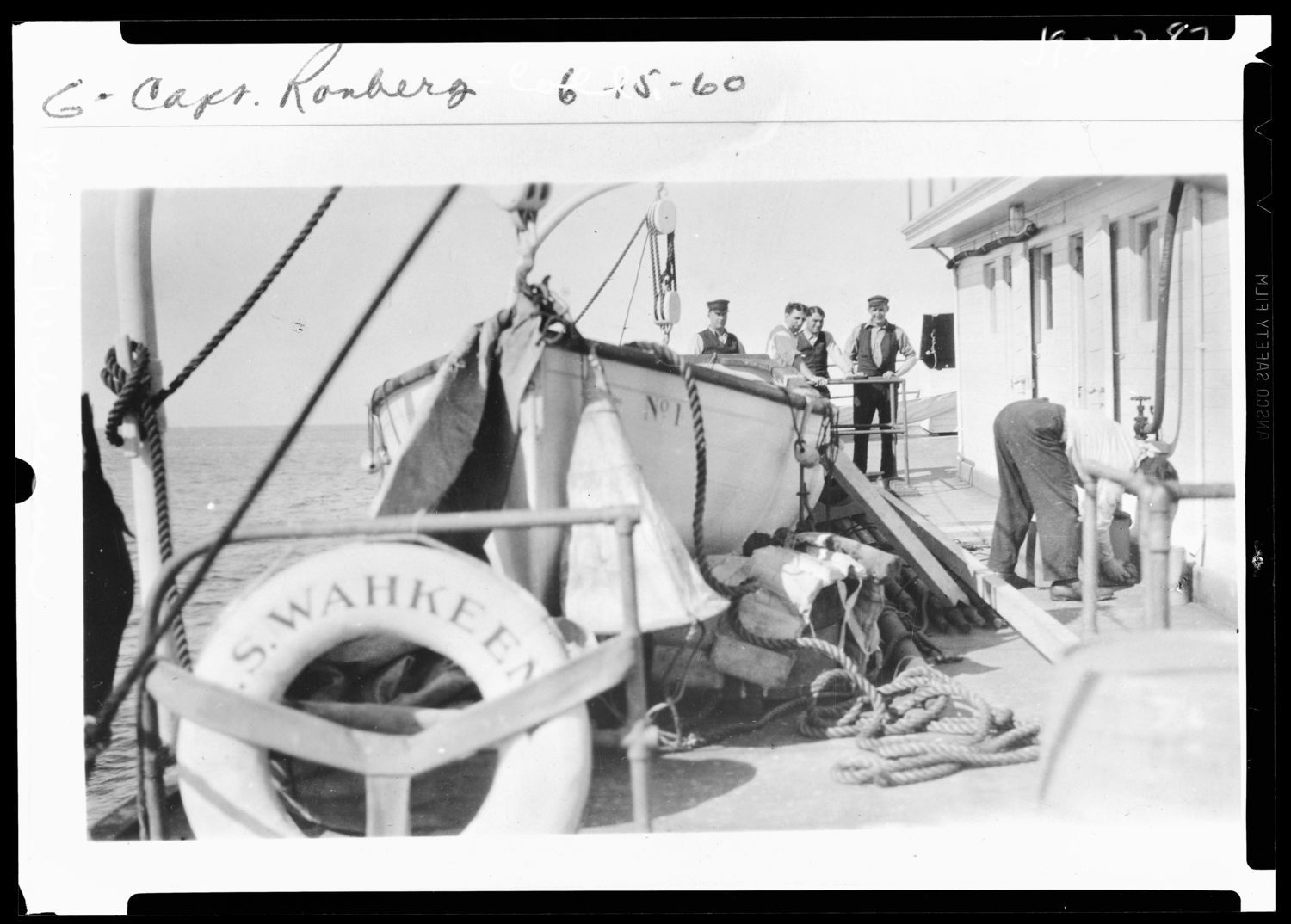 Getting the life coats ready for inspection. The four men seen to the rear are Third Mate, Goodman; first Asst. Engineer Johnson; Captain Johansen; and Second Mate Niels C. Ronberg.