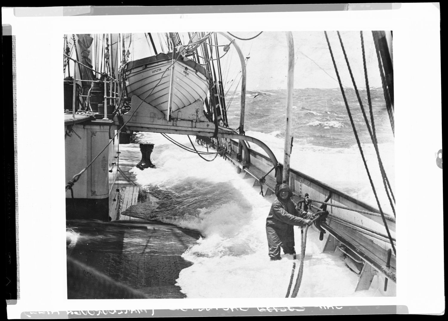 Castleton (ship, ?m) crewman working on deck during heavy weather, undated