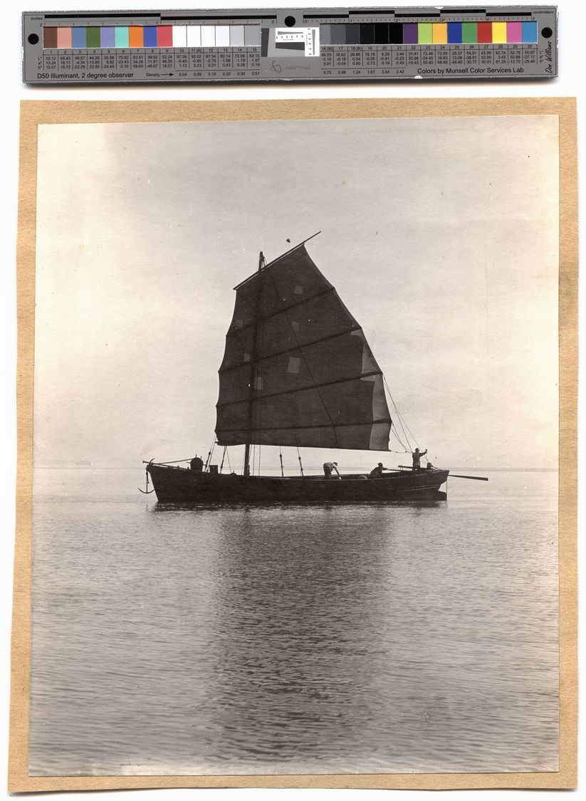 Unidentified Chinese shrimp junk, beam view, probably on San Francisco Bay, CA, circa 1880-1889