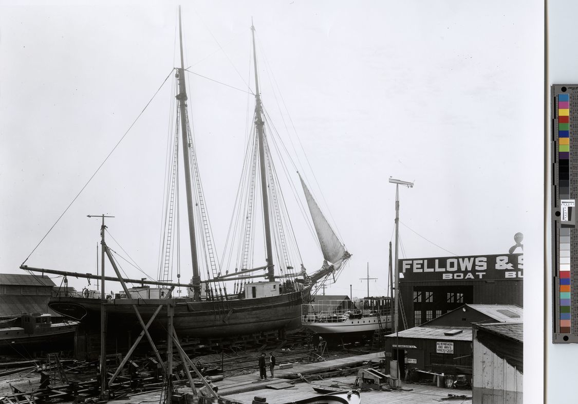 Lily (built 1882; schooner, 2m) hauled out at Fellows & Stewart bot yard, probably at San Pedro, CA, undated