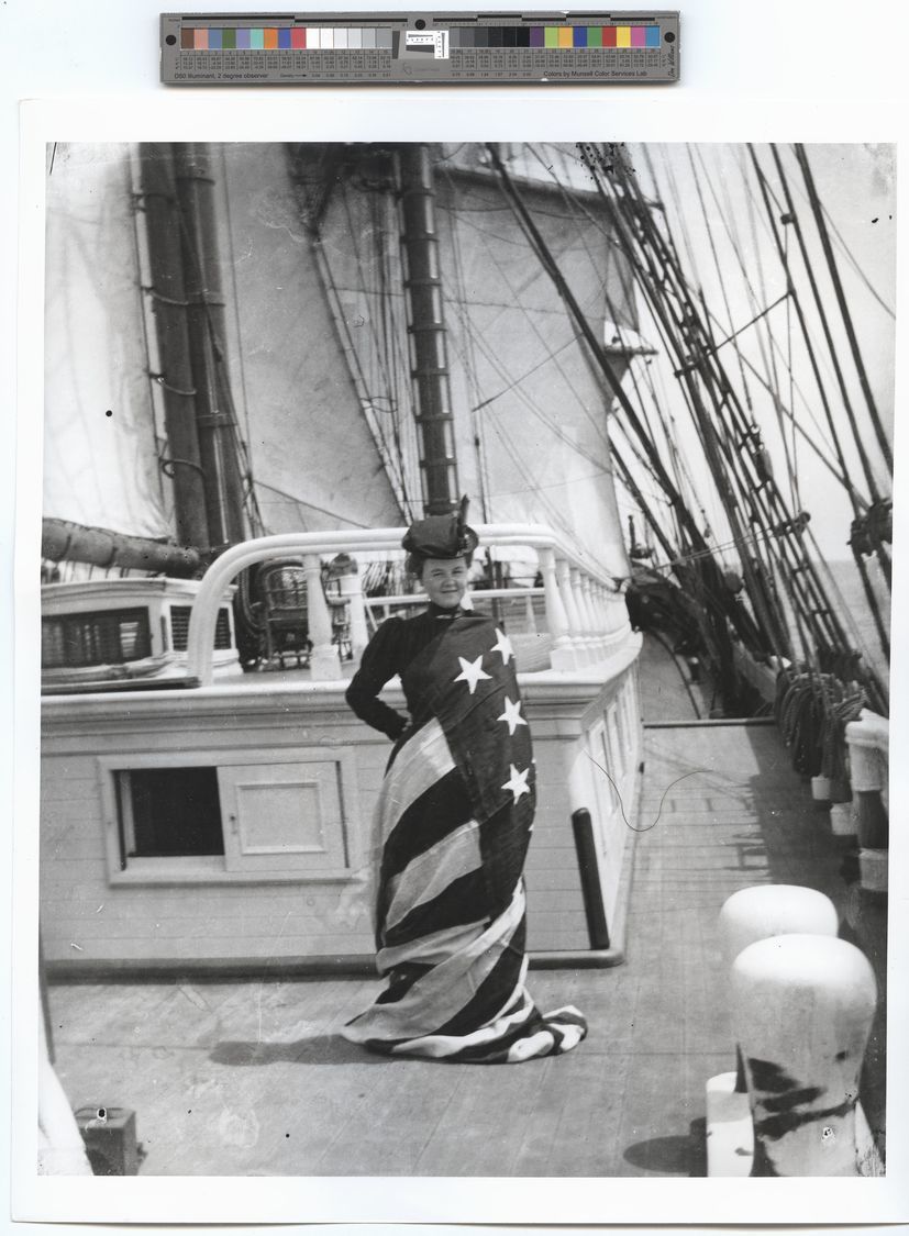 St. James (bark, 3m) view on board of Agnes Tapley wrapped in an American flag, undated