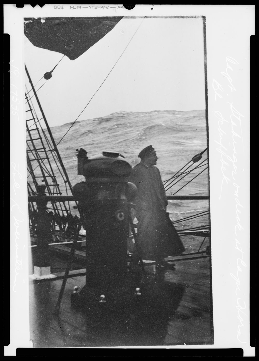 Captain Max Stabinger on the deck of the Schiffbek (built 1886; bark, 4m) at Cape Horn, 1914
