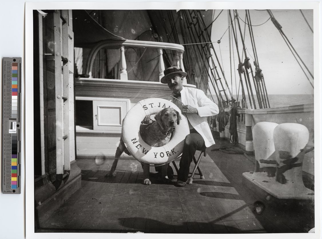 St. James (bark, 3m) aft view on board of Capt. Tapley and a dog, undated