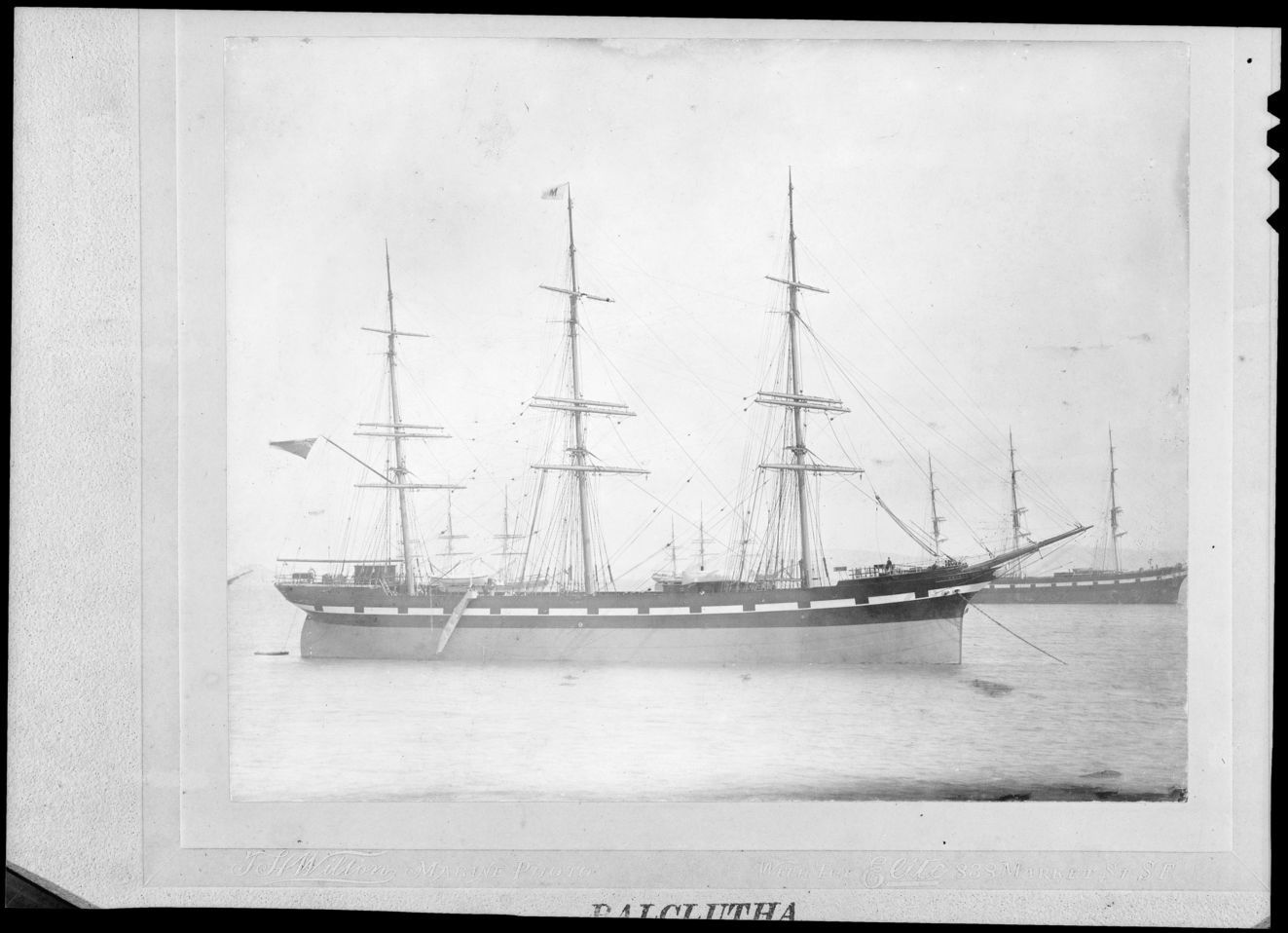 Balclutha (built 1886; ship, 3m) at anchor in the stream in San Franicsco Bay, Calif., circa 1886