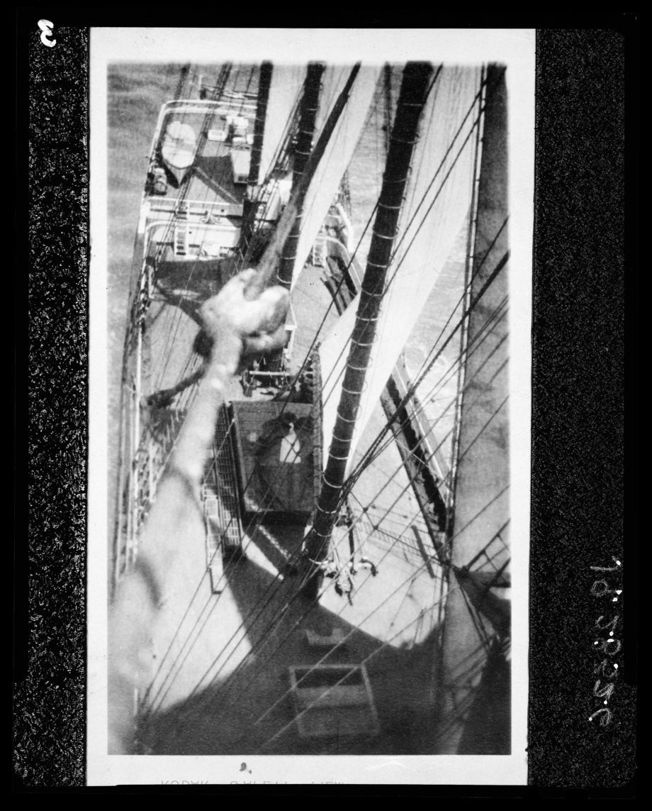Thomas P. Emigh (built 1901; barkentine, 4m) view on board looking down on the deck from aloft, undated