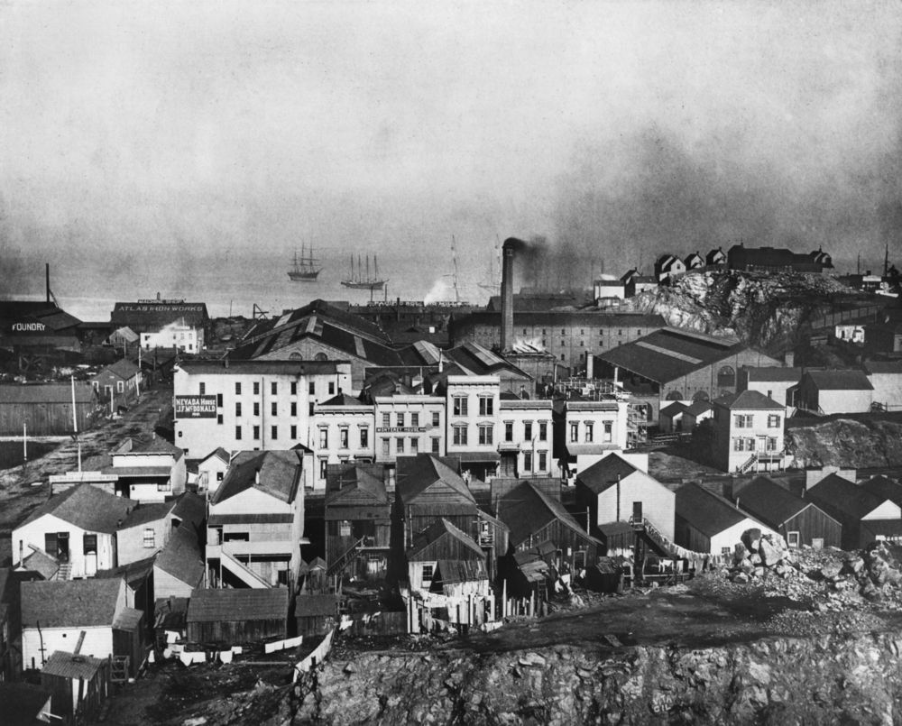 View includes the Atlas Iron Works, the Nevada House on the southwest corner of Napa (20th) & Michigan and the Monterey House at 909 Illinois. Same image as A11.00134 n. Image reproduced in John Kemble's book, "San Francisco Bay: A Pictorial Maritime History," p. 65, with the following information: "Industrial San Francisco in the 1870's....The foundries and iron works turned out steamboat engines and railway locomotives as well as mining machinery. Iron and steel shipbuilding in San Francisco developed from them. Beyond the dwellings in the foreground is a row of saloons and boarding houses typical of the waterfront district of the city." Note on print enclosure: "Look up Scotch Hill and Irish Hill." See also scr50:135 with date 1892.