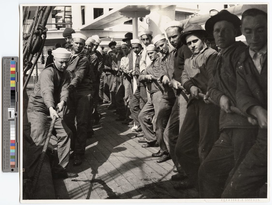 Iris (built 1885; auxiliary barkentine?: training ship) view on board showing crew members posing while hauling on lines, circa 1919-1920