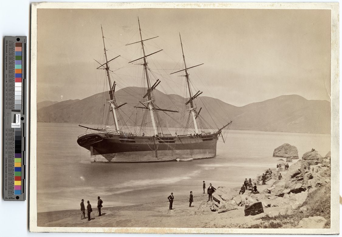 Frank Jones (built 1873; ship, 3m) ashore south of Fort Point, San Francisco, CA, 1877 Mar 30