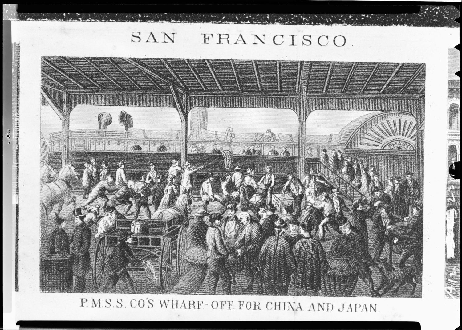 Photo of a drawing. SAN FRANCISCO/P.M.S.S. CO'S WHARF -- OFF FOR CHINA AND JAPAN.