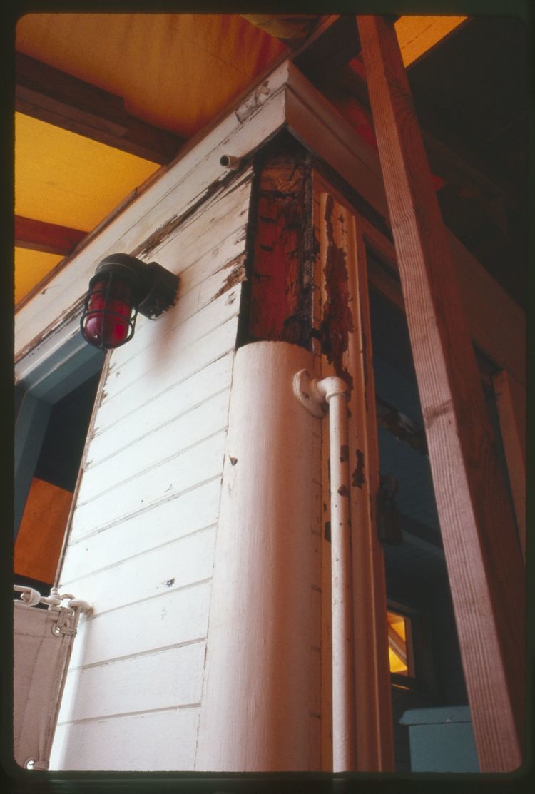 Exterior corner of the wheelhouse is seen from underneath a yellow tarp, showing rot.