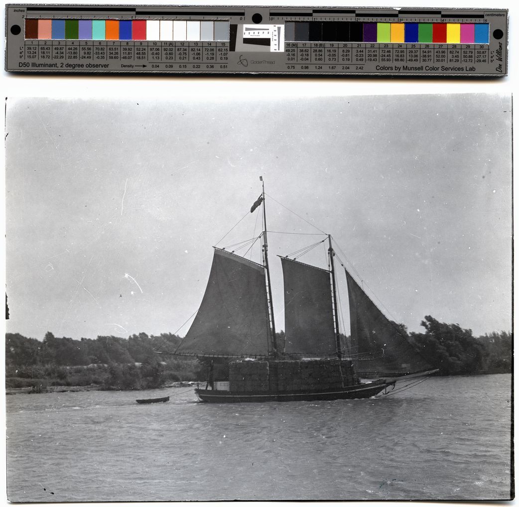 H. Bendel (scow schooner), with a load of hay, under way, undated