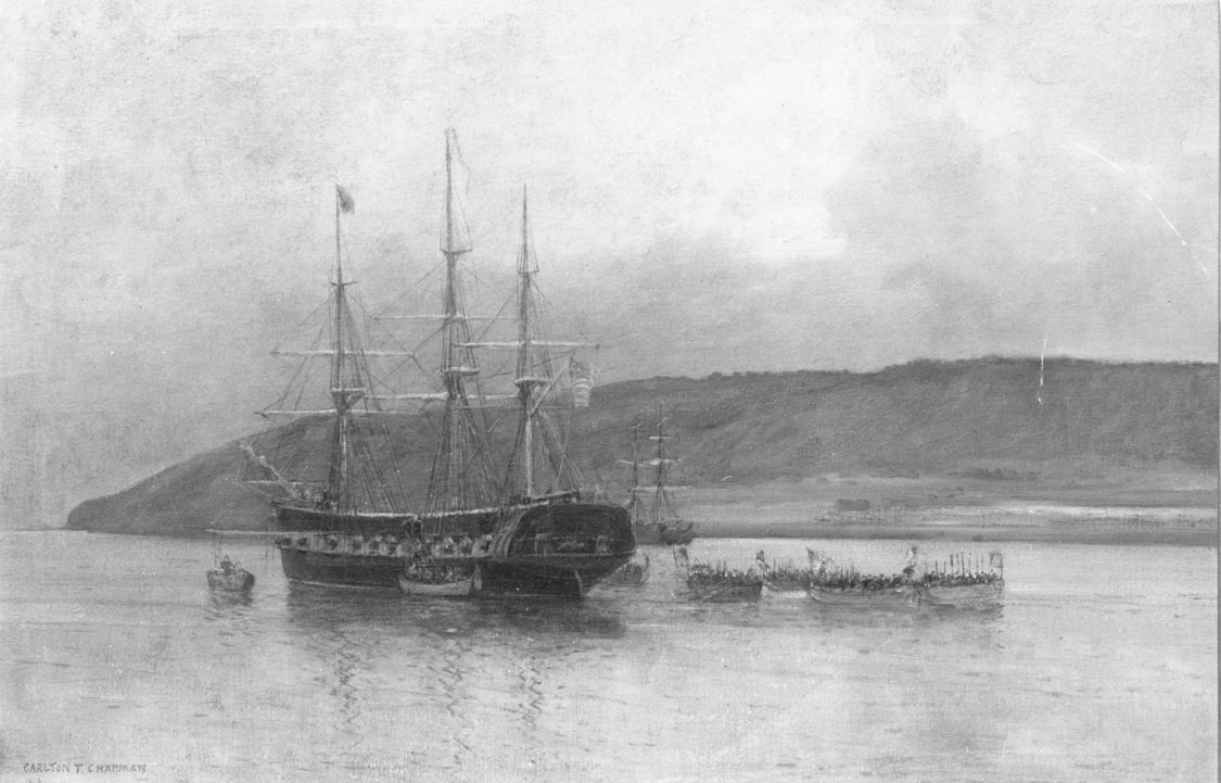 Photo of a painting. Artist signed and dated "1913" in the lower left corner. CYANE, under the command of Commander Samuel du Pont, captured San Diego during the Mexican-American War. Note artist's license was taken - she did not have a flush deck. Gift - Jerry MacMullen.