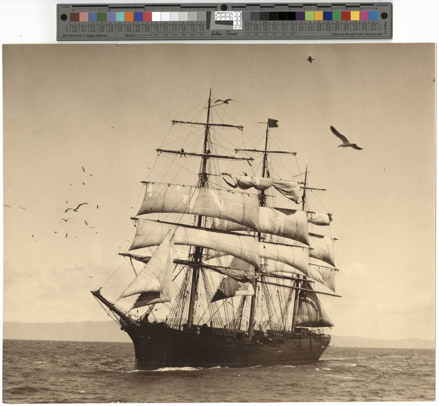 Port bow view. Note men aloft. Flying seagulls also in view. Source of n: Mrs. Eleanor Knudsen loan? Source of x print: Gift - William O. Wagener, 5/9/52.