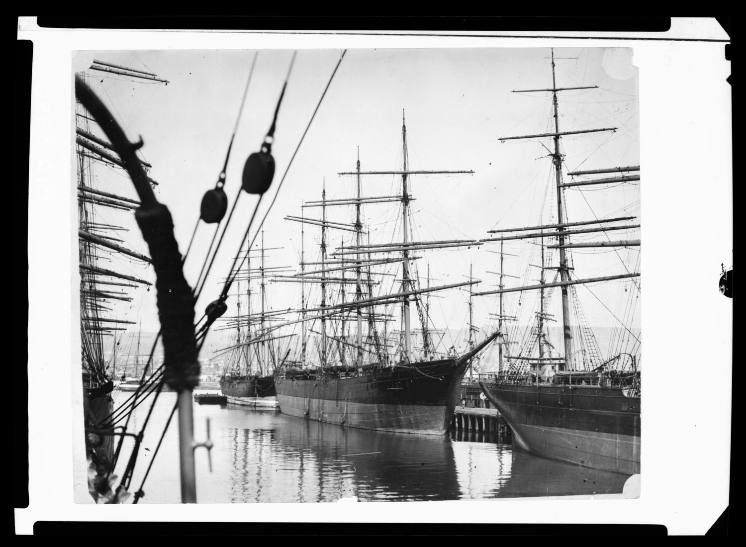 View includes the STAR OF ALASKA (built 1886; ship, 3m) at the right. Information on the back of the large print: "A view, between two sister ships, of the STAR OF ZEALAND, as she awaits the command to hurry as a unit of the Alaska Packers fleet Alaska bound. The ship is now docked in the estuary."