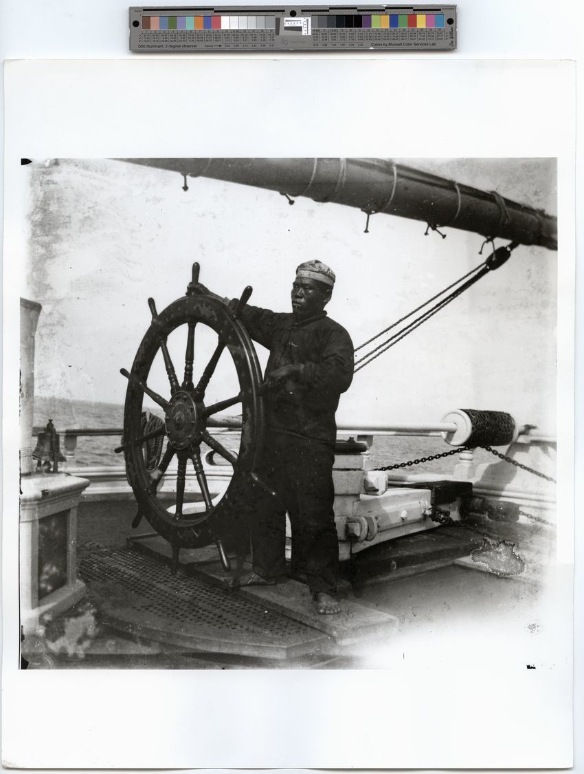 Challenger (bark, ?m) view on board of a Chinese? sailor at the wheel, possibly 1898