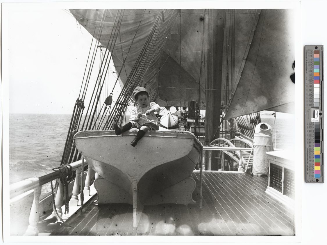 St. James (bark, 3m) view on board of baby Adelaide Tapley seated on a dory, undated