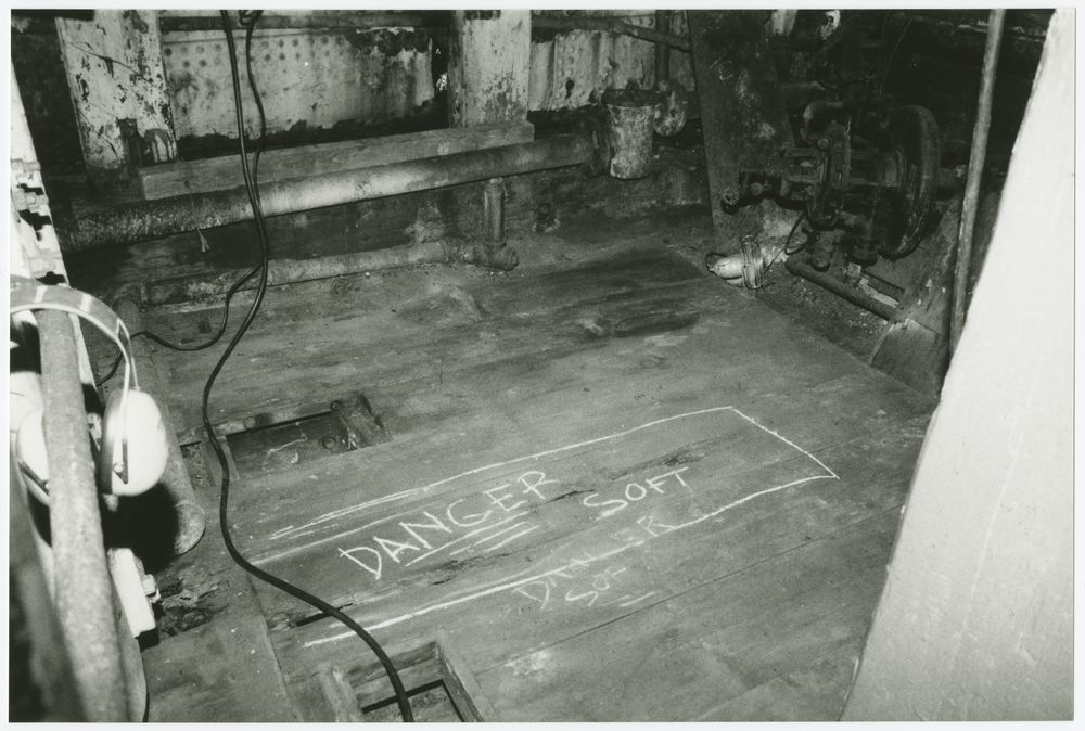 Condition survey photograph of the engine room floor: "Danger Soft," is written twice on the floor with a large box around it, showing the deterioration of the wood.