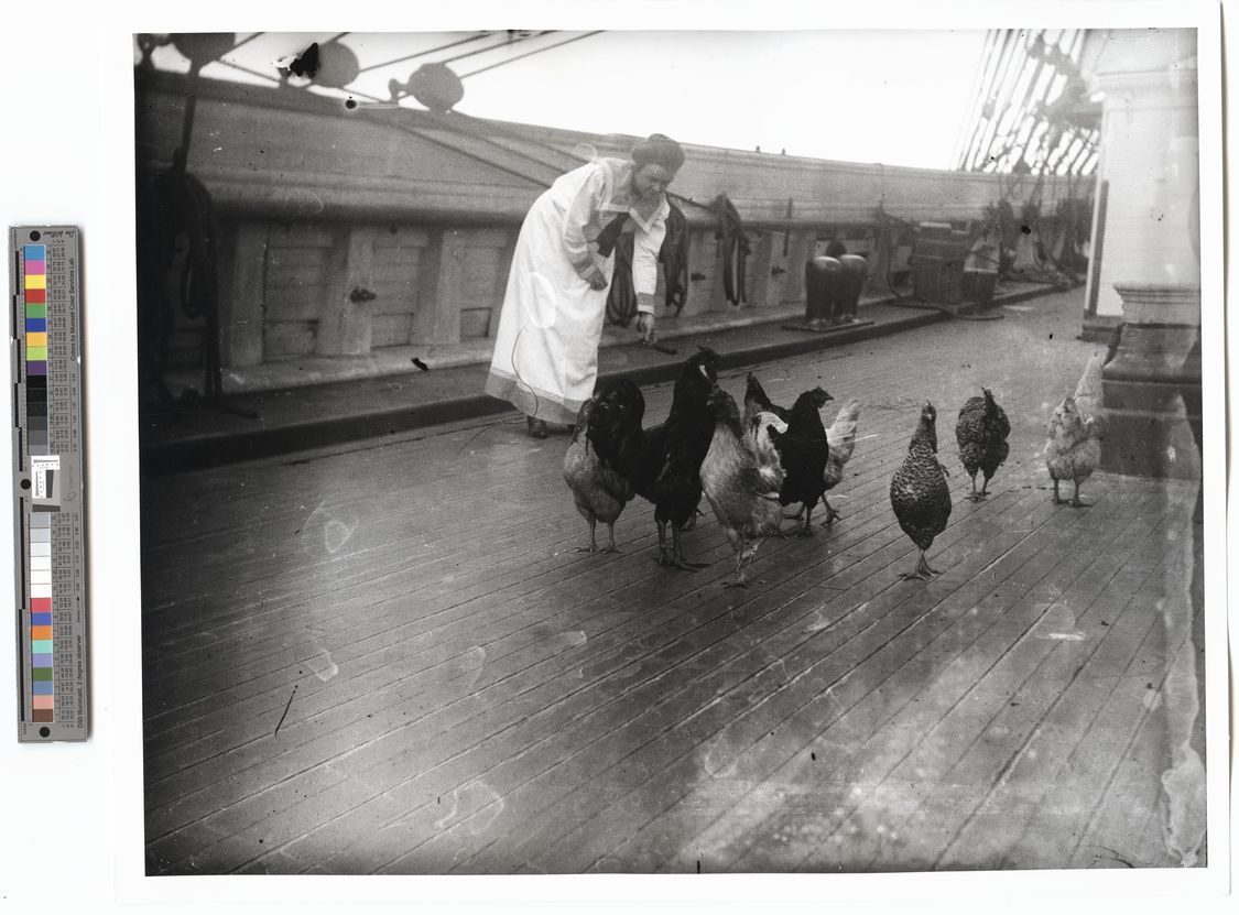St. James (bark, 3m) view on the main deck, port waist, of Agnes Tapley feeding the hens, undated