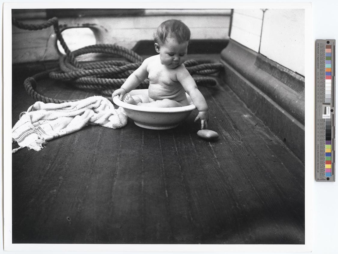 St. James (bark, 3m) view on board of baby Adelaide Tapley having a bath, undated