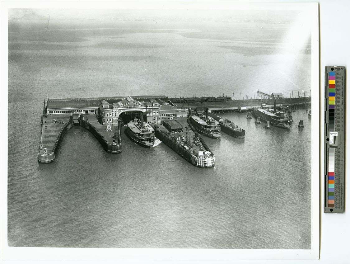 Aerial view includes the YERBA BUENA (built 1927; ferry) at left. Two other Key System ferries in their slips in view.