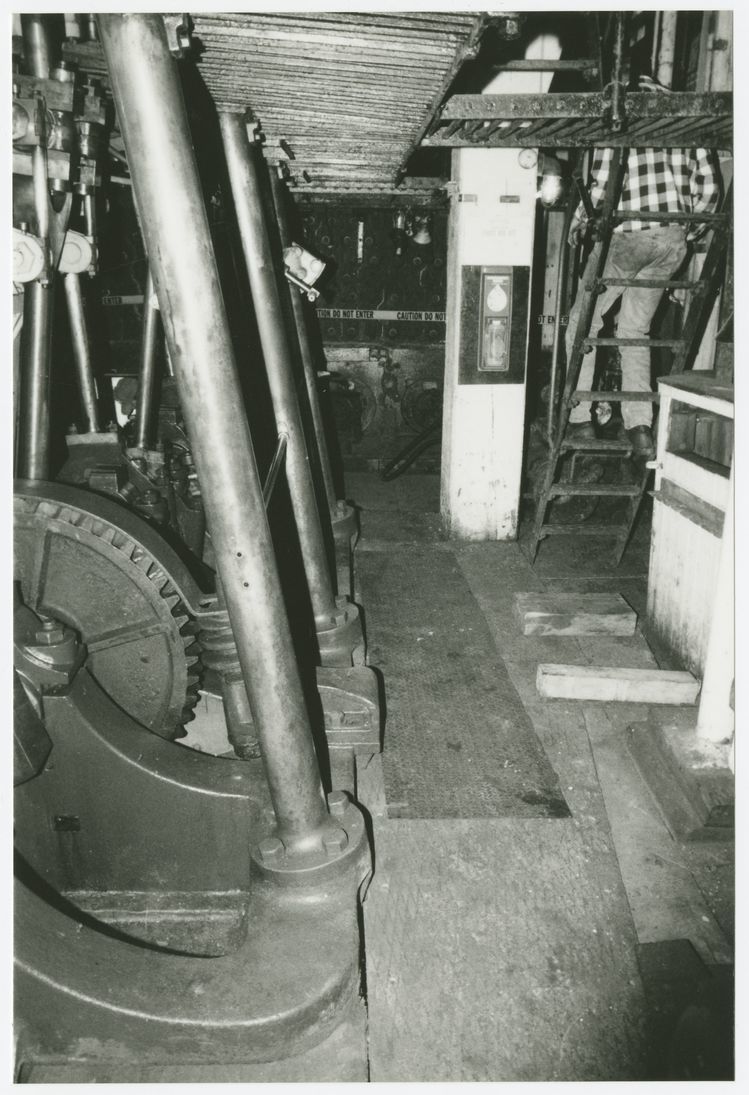 Condition survey photograph of the engine room with engine componants on the left and caution tape visible at the end of the room. The back of a man can be seen coming down the stairs on the right.
