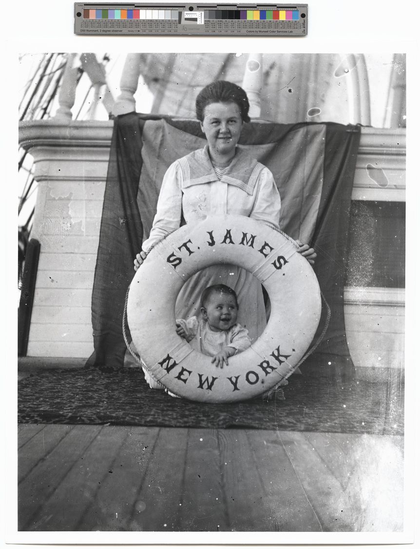 St. James (bark, 3m) view on board of Agnes and Adelaide Tapley posing with the life preserver, undated