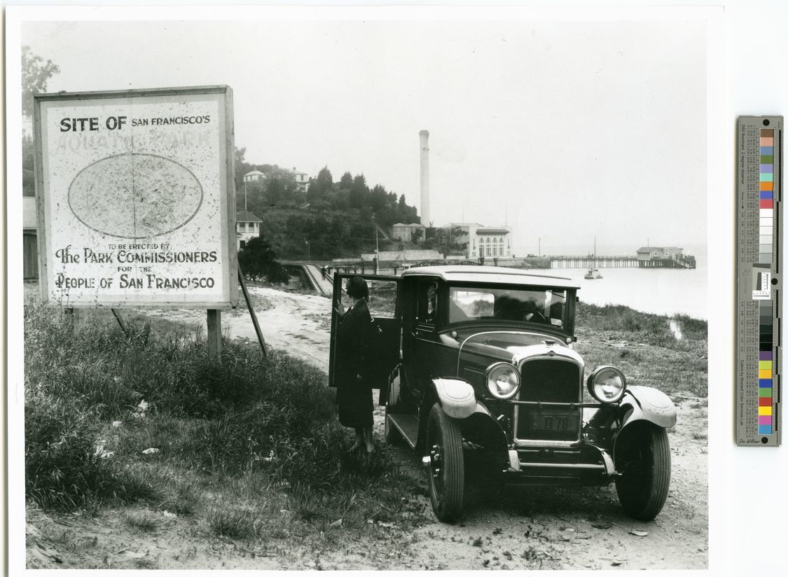 View includes sign announcing the up-coming construction which reads, "SITE OF SAN FRANCISCO'S AQUATIC PARK TO BE ERECTED BY THE PARK COMMISSIONERS FOR THE PEOPLE OF SAN FRANCISCO". Automobile in the foreground (license plate D78) with a man inside, and a woman standing outside with her hand on the door. Dolphin Rowing Club boathouse can be seen in the background, as well as the elevated railroad trestle over its dock. Pumping Station No. 2 is in the background as well. [CR][CR]Photograph from Randolph Brandt.