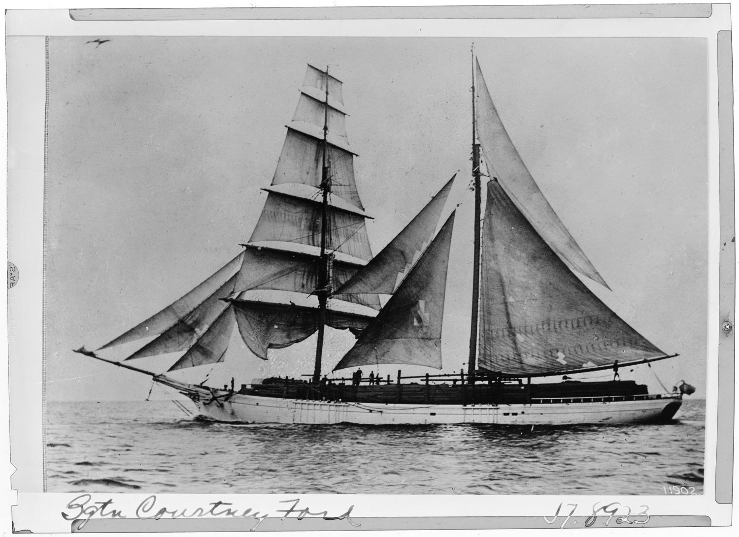 Courtney Ford (brigantine), beam view, under way with deckload, undated