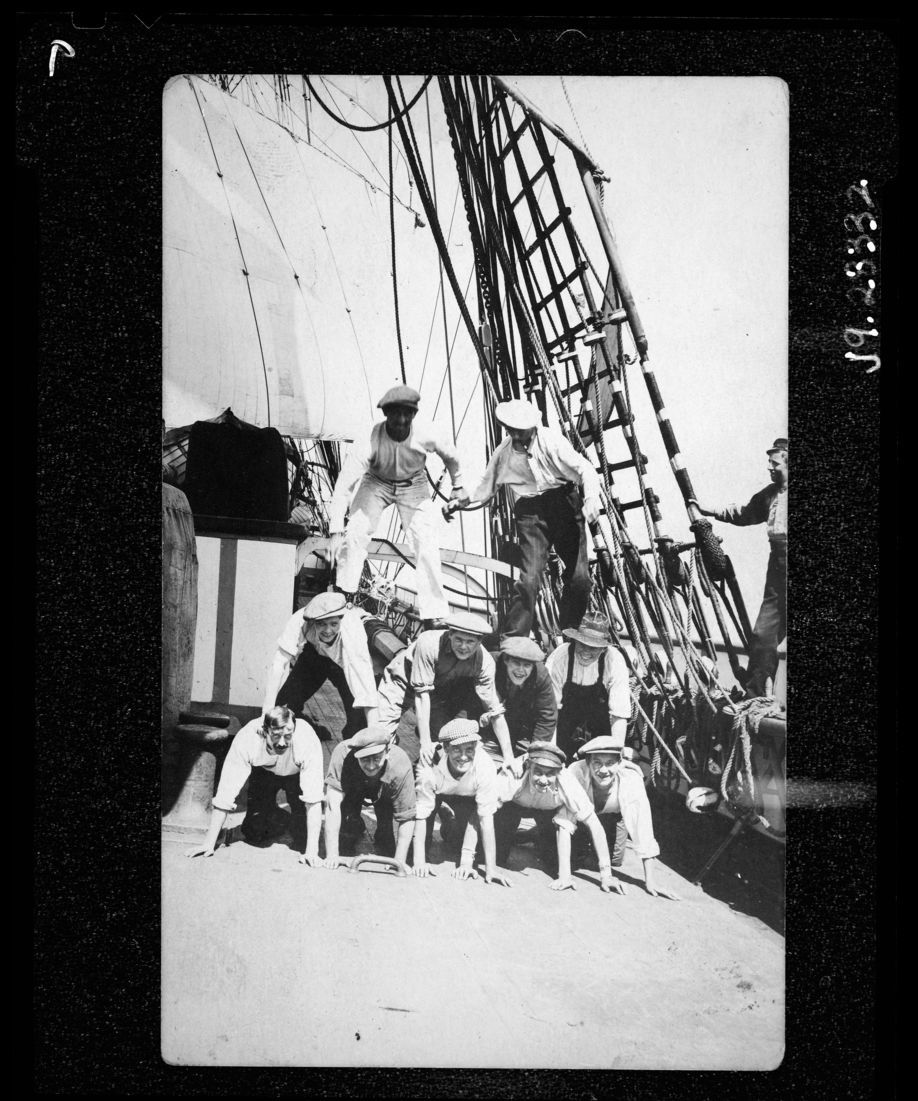 Siraa (ship, ?m) view on board of the crew forming a pyramid, undated