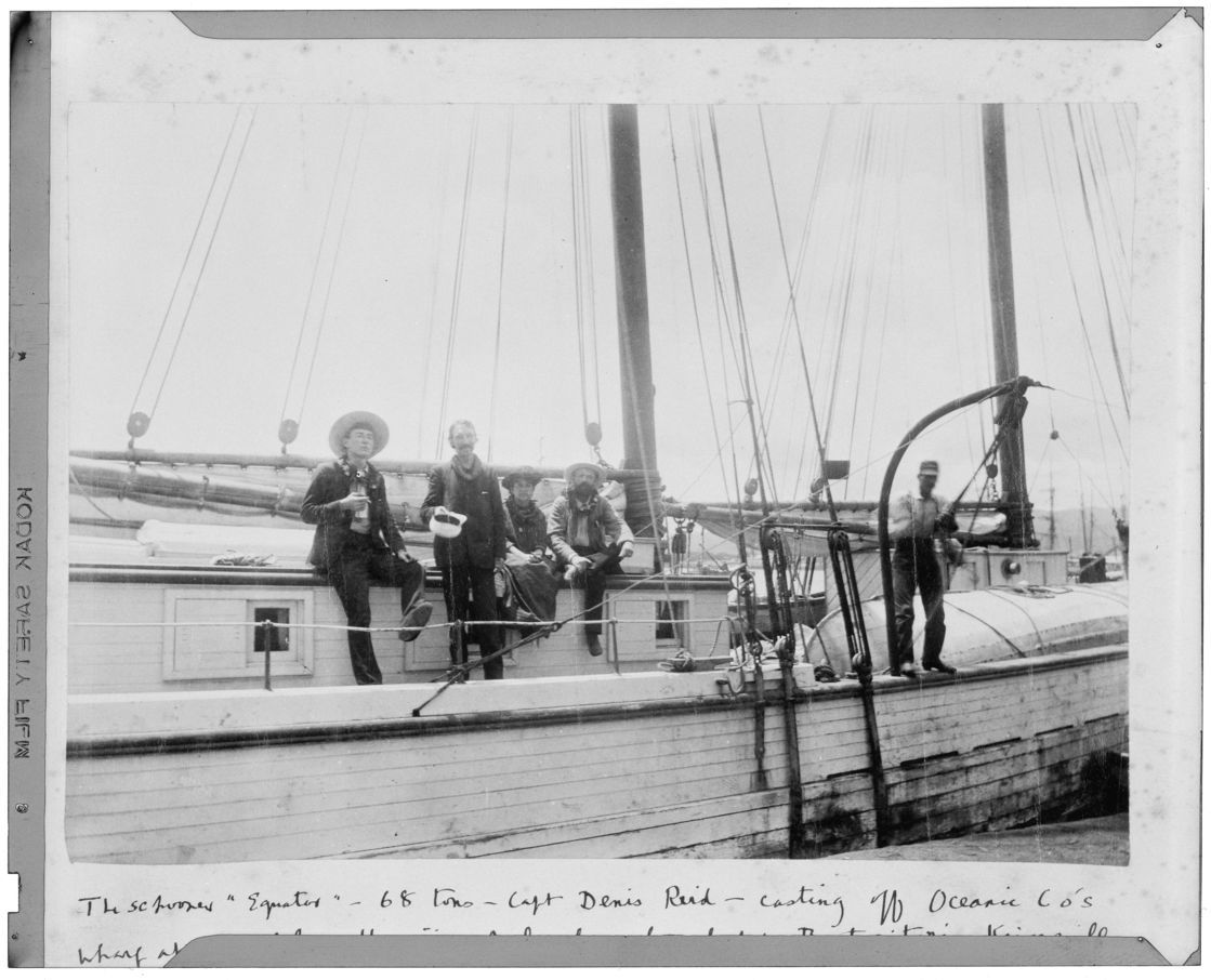 Equator (schooner, 2m) view on board of five men casting off at the Oceanic Wharf at Honolulu, Hawaii, undated