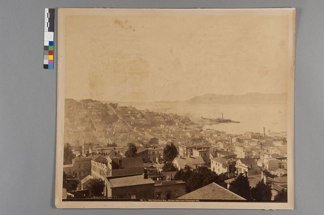 One in a series of six. Source: "L&C - Wells Fargo History Room 6-1-1962." See info. file for more information. The panorama was dated based on the presence of these 3 buildings: Sea Wall Hotel, Crystal Swimming Baths & San Francisco Stock Brewery. No. 1. San Francisco Bay. -Golden Gate from Telegraph Hill.