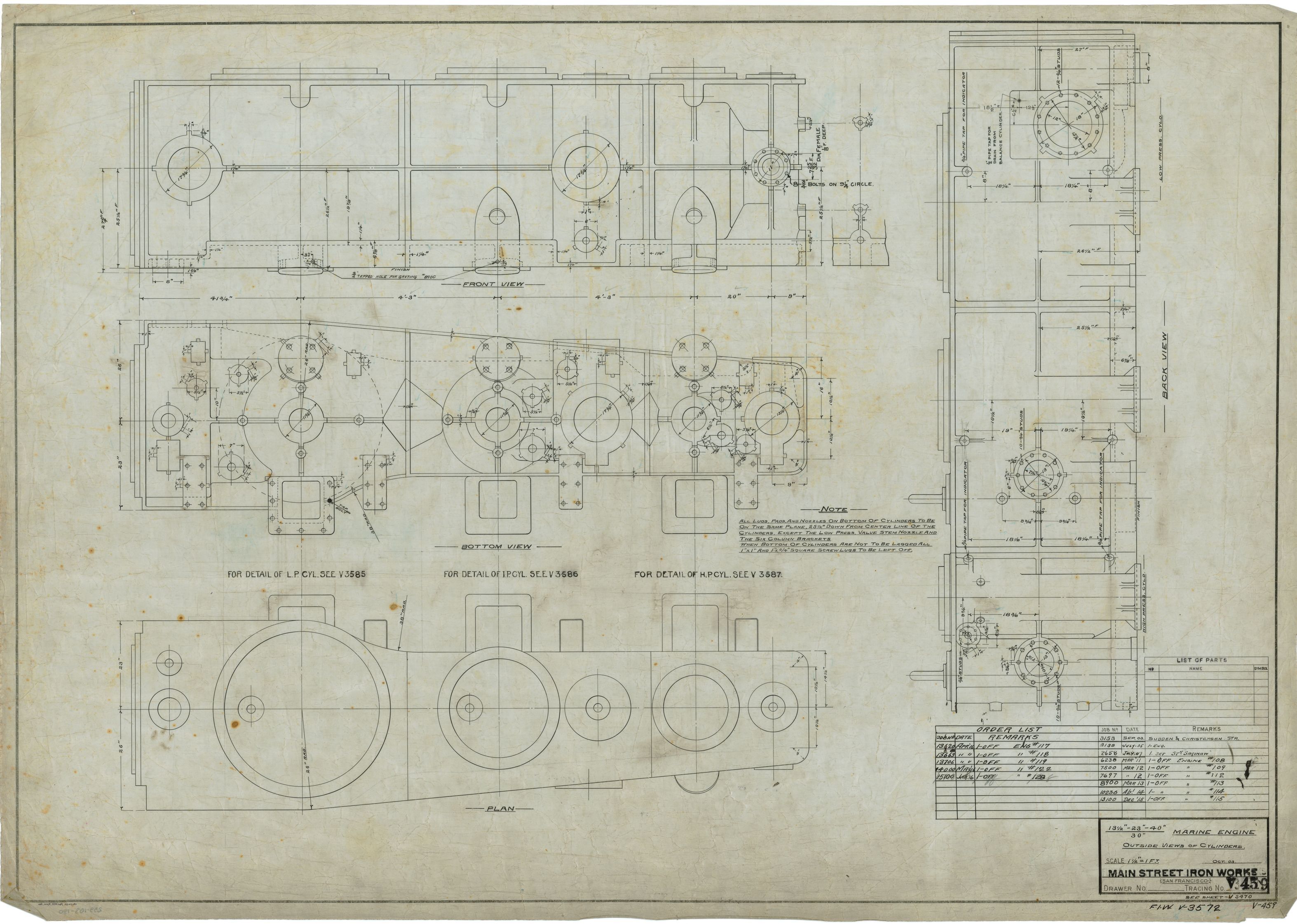 Multiple named vessels, including "Sudden & Christensen Str.", and SAGINAW (built 1907; steam schooner). Plan is also marked with multiple engine or job numbers not idetified by vessel name. Plan is marked with the Fulton Iron Works number V3572 and the Main Street Iron Works number V3459 [or V-459], and a note "see sheet V3470."