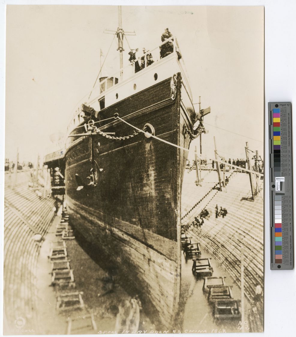 China (passenger vessel) in drydock at Hunters Point, San Francisco, CA, 1868