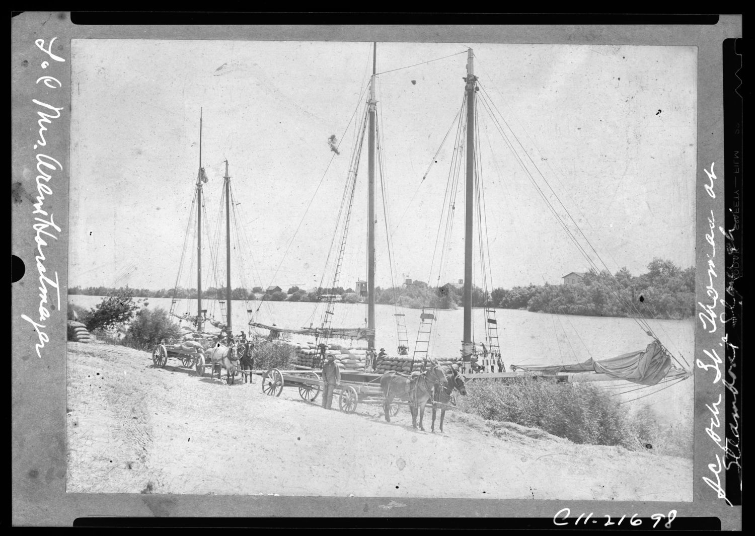View includes ST. THOMAS (scow schooner) and another unid. scow schooner. Note horses and wagons. Source: "L&C - Mrs. Arend Horstmeyer"