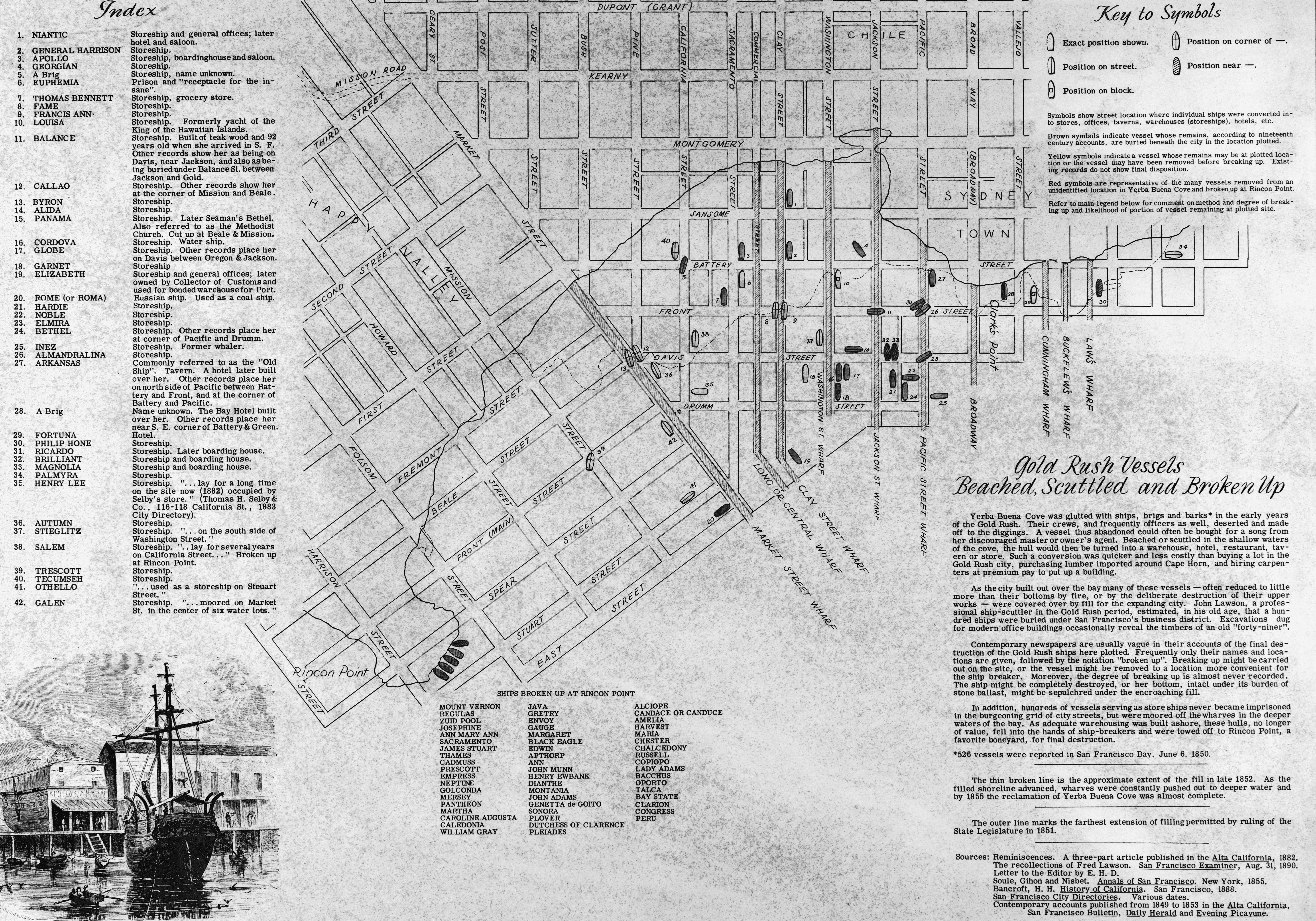 Map of the San Francisco waterfront, including Rincon Point, Yerba Buena Cove, and Clark's Point. Shows outline of the Gold-Rush era waterfront and later landfill. On the left is an index of 42 vessels, and their burial locations are indicated on the map. There is also a list of vessels broken up at Rincon Point. In the lower left corner is an illustration of the prison brig EUPHEMIA and storeship APOLLO. Compiled by Karl Kortum and Harlan Soeten. Copyright 1963.
