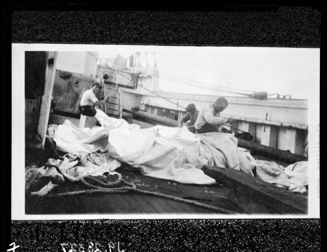 Thomas P. Emigh (built 1901; barkentine, 4m) view on board of men sewing sails aft on port side, undated
