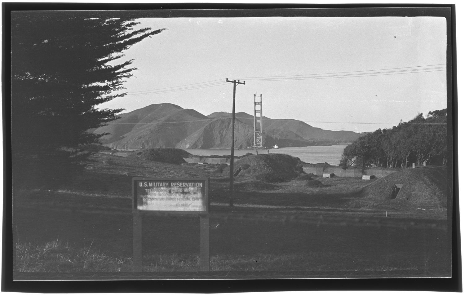 Marin tower of Golden Gate Bridge seen from the Presidio Road. In foreground, old fortifications where smoothe bore cannon of Civil war days were mounted.