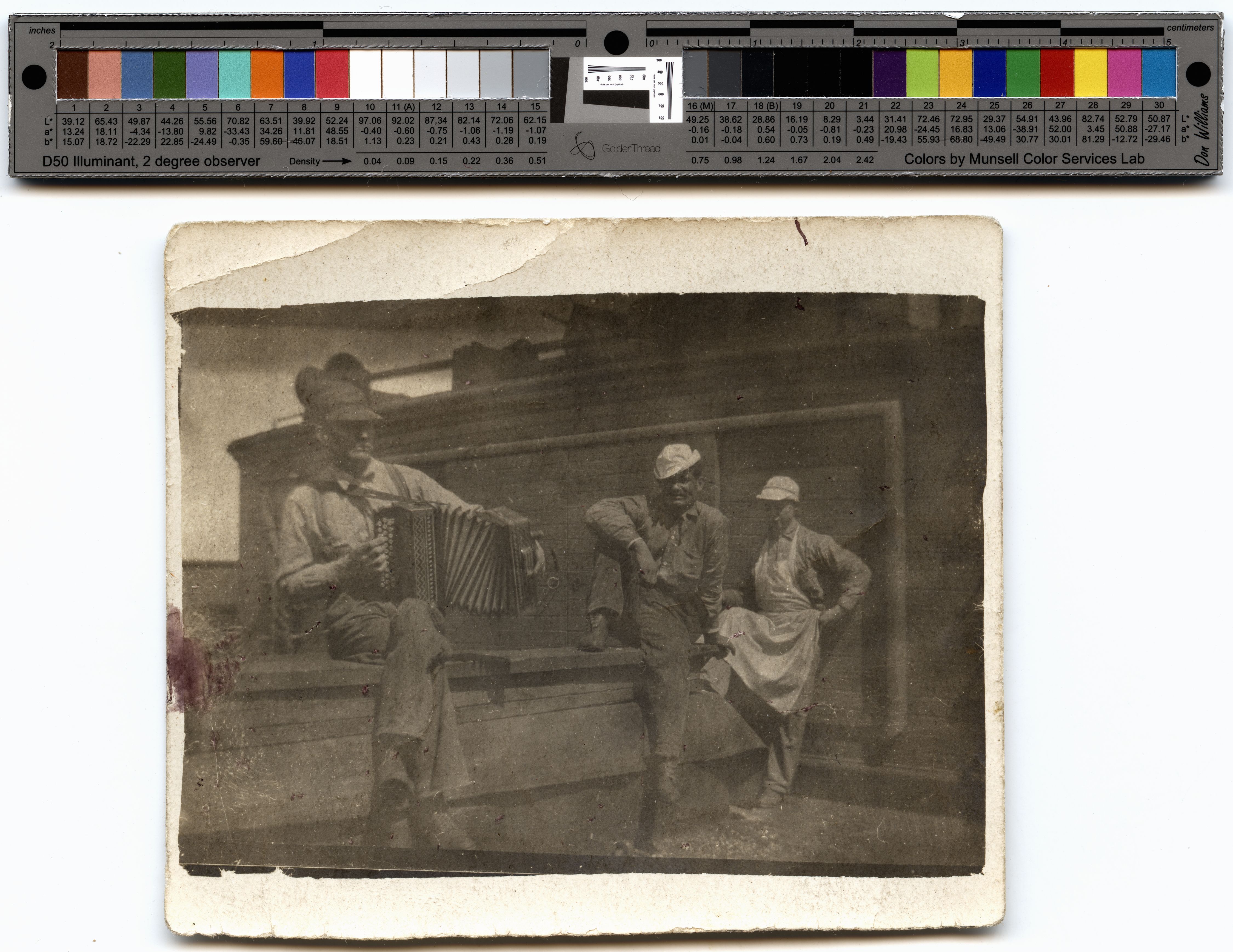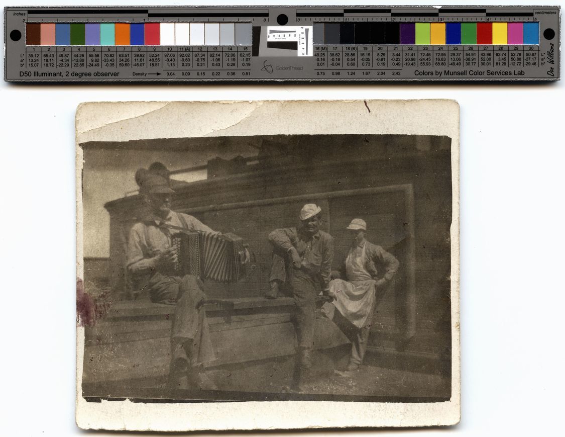 Three men in view. One of them is playing the accordion. Loan - Hagen.