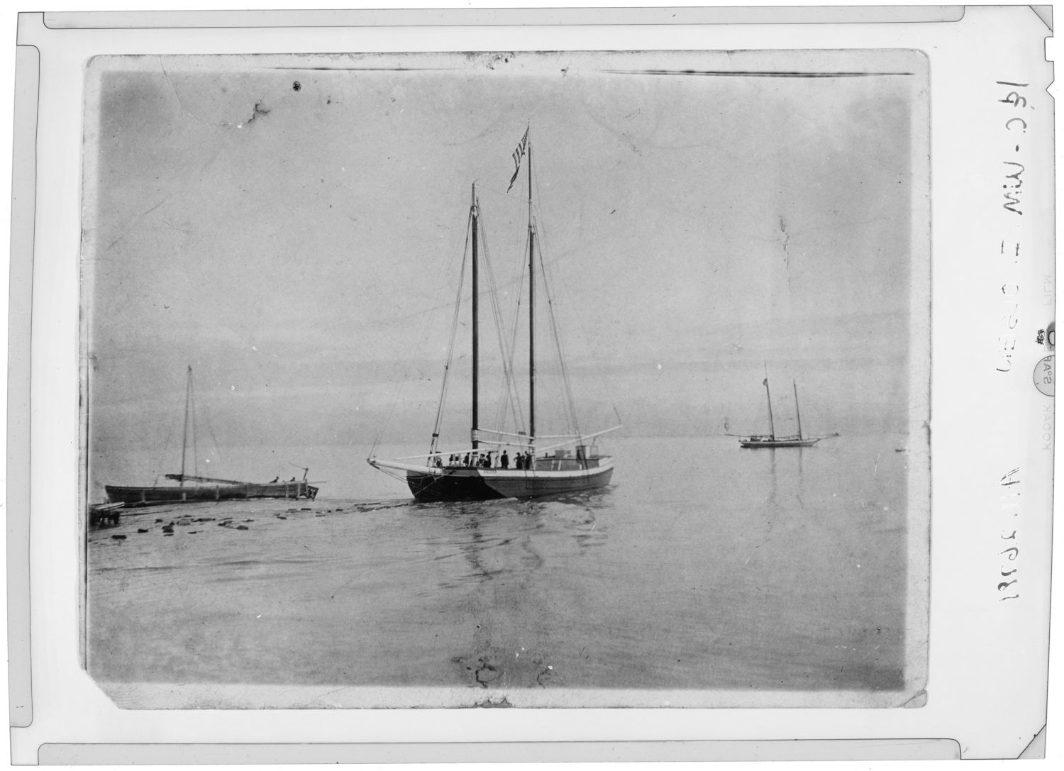 Per note on the enclosure, "She was christened by Erma Olsen, age 2 or 3 at the time. She is now Mrs. Irvin Reichardt of Media, Penn - 1972." Source: "L&C - Wm. I. Olsen" ERMA was built at the Wm. Munder & Sons shipyard in San Francisco, CA. The view includes another unid. 2-masted schooner in the distance.