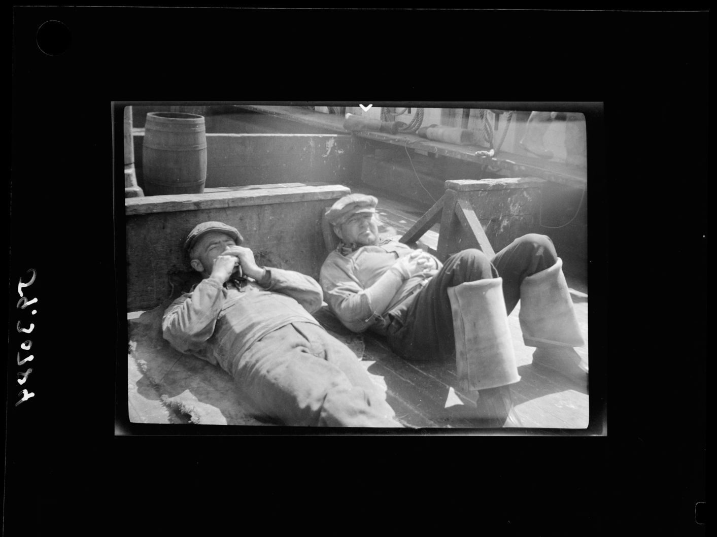 Sophie Christenson (built 1901; schooner, 4m) view on deck of two men, "Bozo" Joregenson and "Broken Ass Ole," relaxing, undated