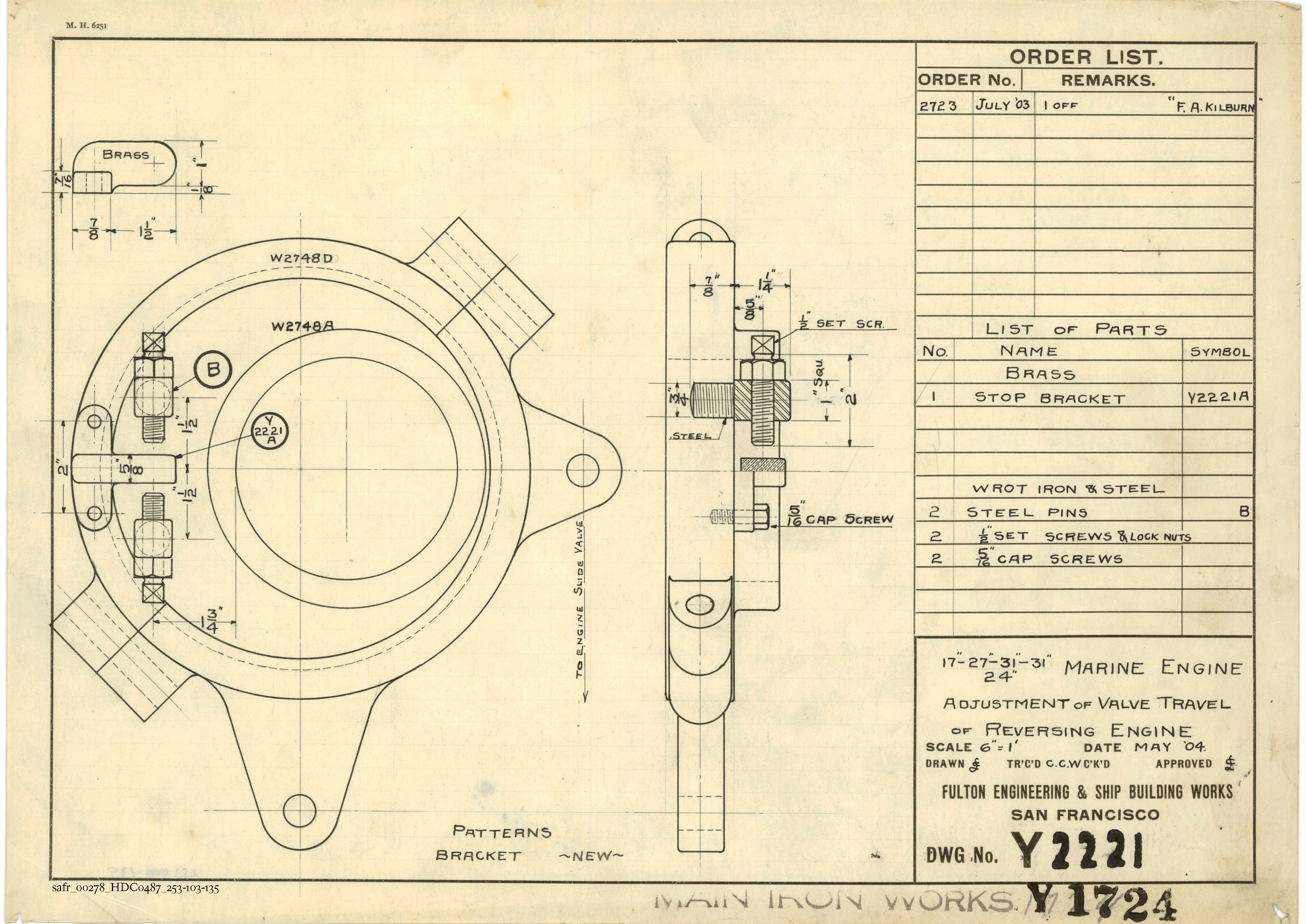 Plan is marked with the Fulton Iron Works number Y2221 and the Main Street Iron Works number Y1724.